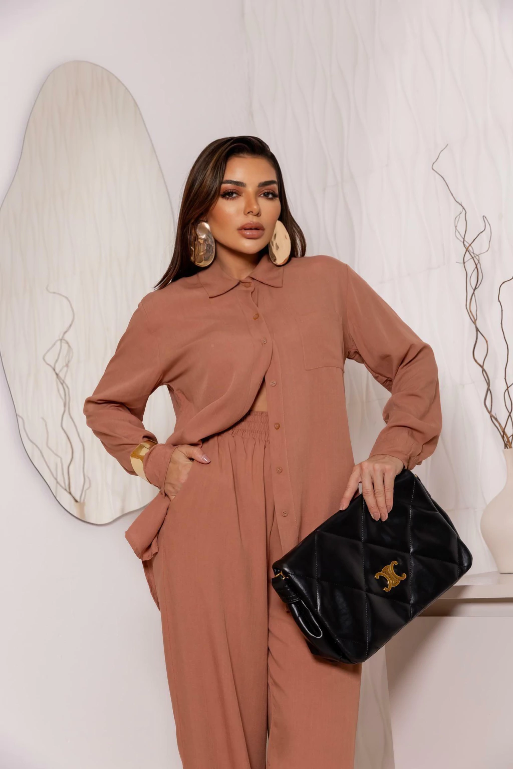Camisa possui botões funcionais na parte frontal e nos punhos, corte oval e bolso frontal funcional.